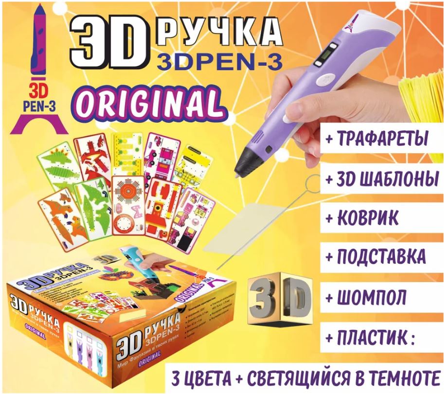 Обратите внимание, только у оригинальных 3Д ручек 3D PEN 3 есть фирменные обозначения на коробке и самом корпусе 3d ручки! Приобретая оригинальную качественную 3Д ручку 3D PEN 3 ORIGINAL, Вы получаете: 1. Идеальное соотношение цена-качество. Вы можете выгодно приобрести комплект с оригинальной качественной 3Д ручкой с гарантией 1 год и со всем необходимым. 2. Ребёнку будет интереснее и проще осваивать 3D ручку, так как в набор уже входит прозрачный термостойкий коврик, различные трафареты и 3D шаблоны. Коврик для 3д рисования позволит использовать трафареты много раз. 3. 3d ручка поставляется исключительно с адаптером. Вы застрахованы от того, что в комплекте, вместо адаптера питания окажется кабель USB. Вам не нужно будет ничего докупать и беспокоиться о совместимости устройств. 4. Чтобы 3D ручка прослужила дольше и не сломалась от забивки остатками пластика, в наборе есть сервисный шомпол. 5. Моток светящегося в темноте пластика в подарок - станет приятным бонусом для ребенка! Тип пластика для 3D печати: ABS, PLA, SBS.