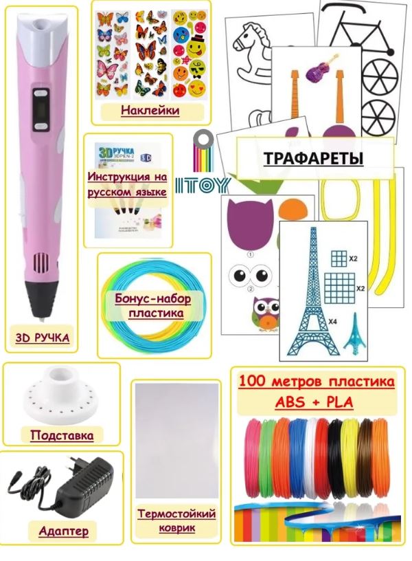 100 метров разного пластика В КОМПЛЕКТЕ! В ваш набор iToy включён запас пластика - целых 100 метров. Весь пластик, входящий в комплект, 100% совместим с 3d ручкой - прекрасно плавится и не застревает. В наборе есть как ABS, так и PLA пластик. Вы сможете рисовать обоими типами пластика.Трафареты и коврик для 3Д ручки. Чтобы ребенку было интереснее и проще начинать осваивать 3D рисование в набор уже входят 8 разных шаблонов и прозрачный термостойкий коврик. Он позволит использовать любые трафареты много раз. 3д ручка поставляется исключительно с адаптером. Вы застрахованы от того, что в комплекте, вместо адаптера питания окажется кабель USB. Вам не нужно будет ничего докупать и беспокоиться о совместимости устройств. Тип пластика для 3D печати: ABS, PLA, SBS. Комплектация: - 3д ручка с дисплеем iTOY Оригинал, - Большой набор пластика для 3д ручки 100 метров ABS (5 цветов по 10 метров) + PLA (5 цветов по 10 метров), - Бонус набор PLA пластика 3 цвета, - Набор трафаретов для 3д ручки, - Термостойкий прозрачный коврик для 3d ручки, - Инструкция на русском языке, - Набор наклеек - 1 лист, - Подставка для 3д ручки, - Адаптер для 3д ручки.