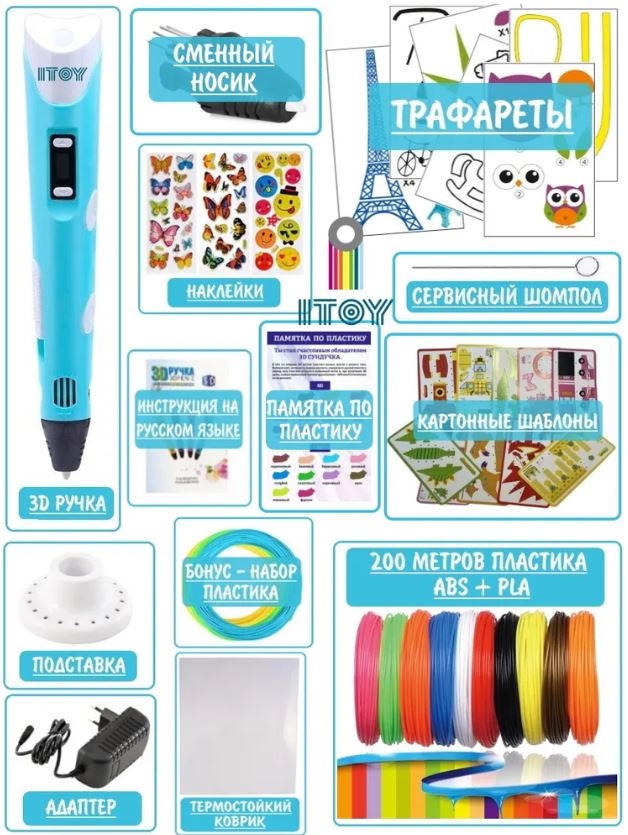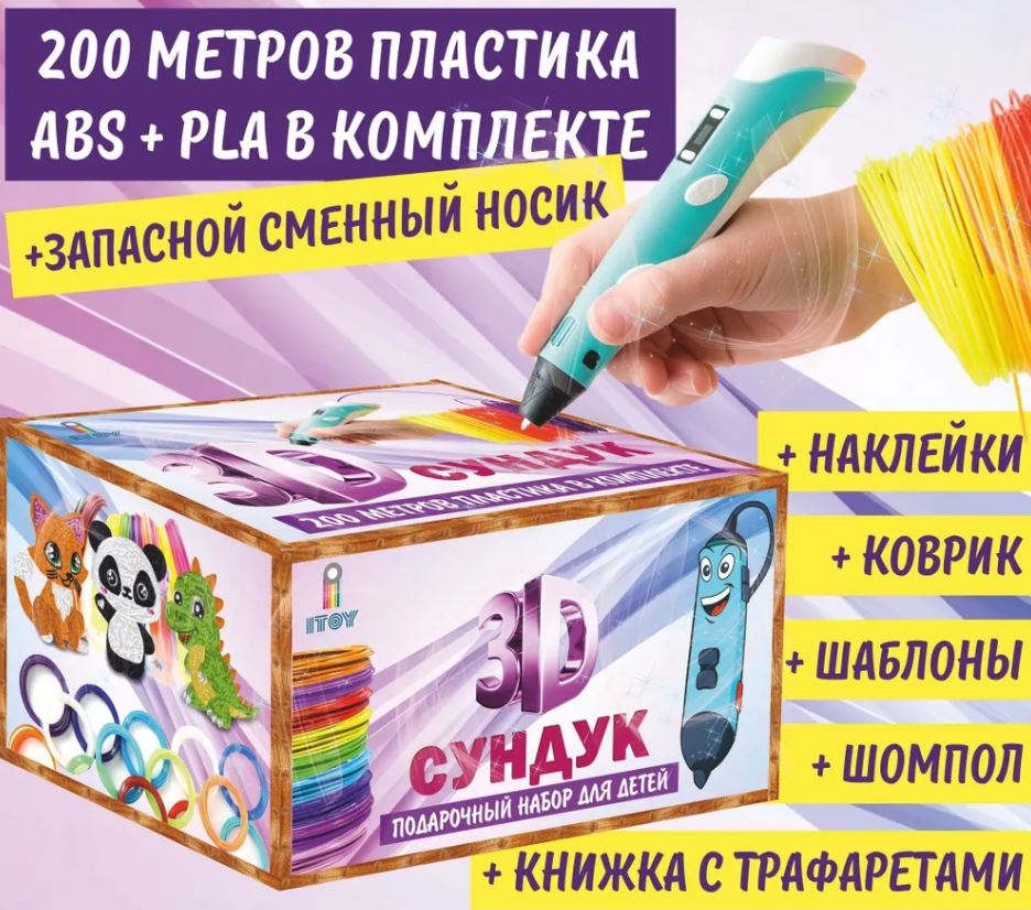 Самый большой и лучший набор с 3д ручкой в России! 1. Оригинальная качественная 3Д ручка с гарантией 2 года 2. В 3Д Сундук включён запас пластика - 20 разных цветов, суммарно 200м + бонус набор 3 цвета. Весь пластик 100% совместим с 3d ручкой - прекрасно плавится и не застревает. В наборе есть как ABS, так и PLA пластик. Попробуйте оба типа пластика и выберите тот, который подойдет именно вам. 3. Памятка по пластику поможет легко определить его тип согласно цветовой палитре, научит сделать так, чтобы ручка служила долго и пластик не застрял. 4. Ребёнку будет интереснее и проще осваивать 3д ручку, тк в набор уже входят трафареты, разные шаблоны и прозрачный коврик. Он позволит использовать трафареты много раз. 5. Запасной носик для 3d ручки самая необходимая запчасть и выручит во многих случаях, когда 3Д ручке требуется ремонт. 6. Чтобы 3D ручка прослужила дольше и не сломалась от забивки. остатками пластика, в наборе есть сервисный шомпол. 7. Наклейки станут приятным сюрпризом для ребенка.
