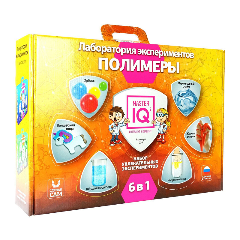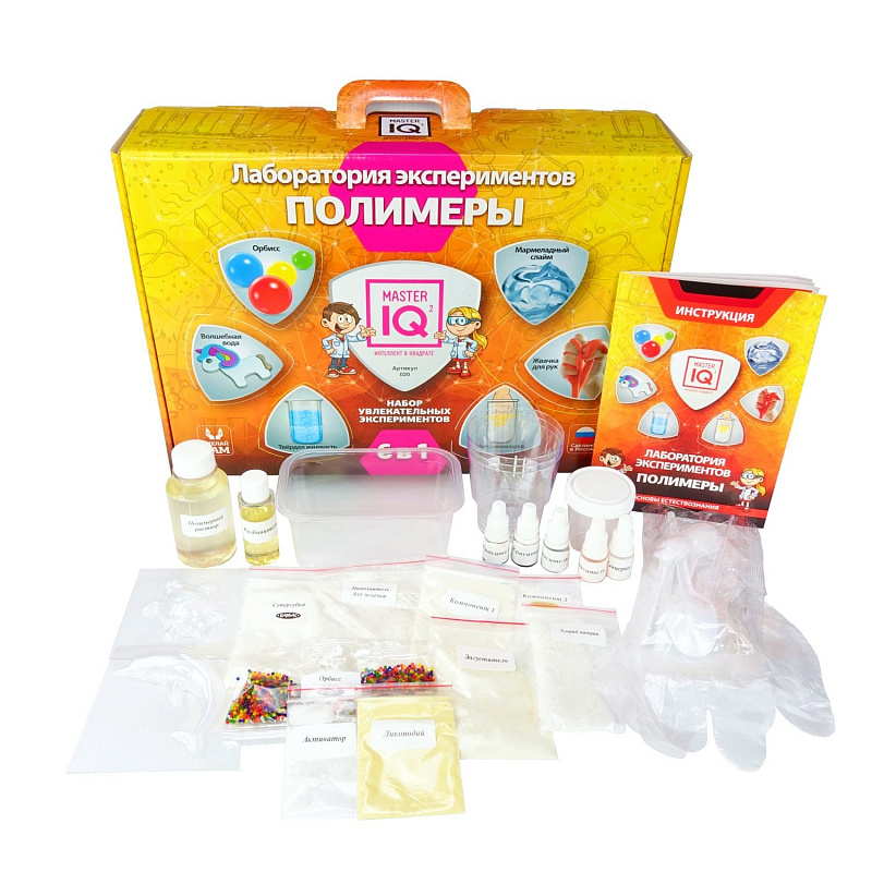 6 экспериментов c полимерами в красивом подарочном наборе. Лаборатория экспериментов включает в себя вещества, оборудование и посуду для проведения 6 независимых опытов, знакомящих ребенка с уникальными состояниями веществ и разными разделами физики и химии. «Полимерные шарики Орбисс» – создай игрушку-антистресс своими руками! Маленькие разноцветные шарики вырастут в сотни раз прямо у вас на глазах. «Твёрдая жидкость» - удиви друзей, превратив воду в гель, а затем снова в жидкость! Опыт позволяет познакомиться с удивительным веществом, которое способно впитать количество воды, в 300 раз превышающее его собственный вес. «Мармеладный слайм» - этот слайм будет напоминать желе или медузу и растекаться в лужицу, его очень приятно мять и рвать на кусочки, а после этого он легко вернётся к изначальной форме. Медуза-слайм совершенно не пачкает руки и ни к чему не липнет. «Волшебная вода» - создай 3D фигурку с помощью волшебной воды, формочки и раствора полимера. Это происходит благодаря химической реакции, которая широко используется для создания необычных блюд. «Непромокашка»- в ходе опыта ты сможешь в прямом смысле «выйти сухим из воды» и познакомиться с явлениями смачиваемости. Вещество из этого опыта на поверхности воды образует сомкнутую несмачиваемую пленку. При погружении пальца в воду пленка ложится вокруг него, как перчатка, и предохраняет его от контакта с водой. Подарочная упаковка - коробка-чемоданчик. 8+