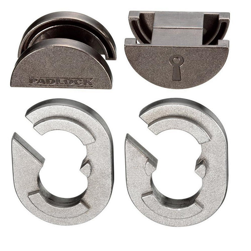 8+.Сложная металлическая головоломка в форме навесного замка. Решение напоминает изучение и исследование замка. Достаточно взять головоломку в руки, чтобы ощутить серьёзность проблемы — эту головоломку будет не просто решить! Замок с секретом состоит из двух эллиптических частей, плотно запертых вместе вокруг круглых частей. Он упрямо отказывается открываться, но нельзя сдаваться. Упорство и смекалка помогут найти решение этой трудной головоломки. Задание: Откройте замок, а затем закройте его снова.