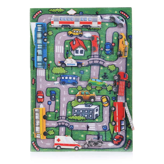 Многоразовая аппликация из фетра. В набор входят:игровое поле, выполненное в виде коврика с нарисованными на нем городом с дорогами, мостами, деревьями и зданиями (28*20 см) 13 фигурок различного транспорта (на липучке). Сзади имеется карман для хранения фигурок. Возраст: от 3-х лет.