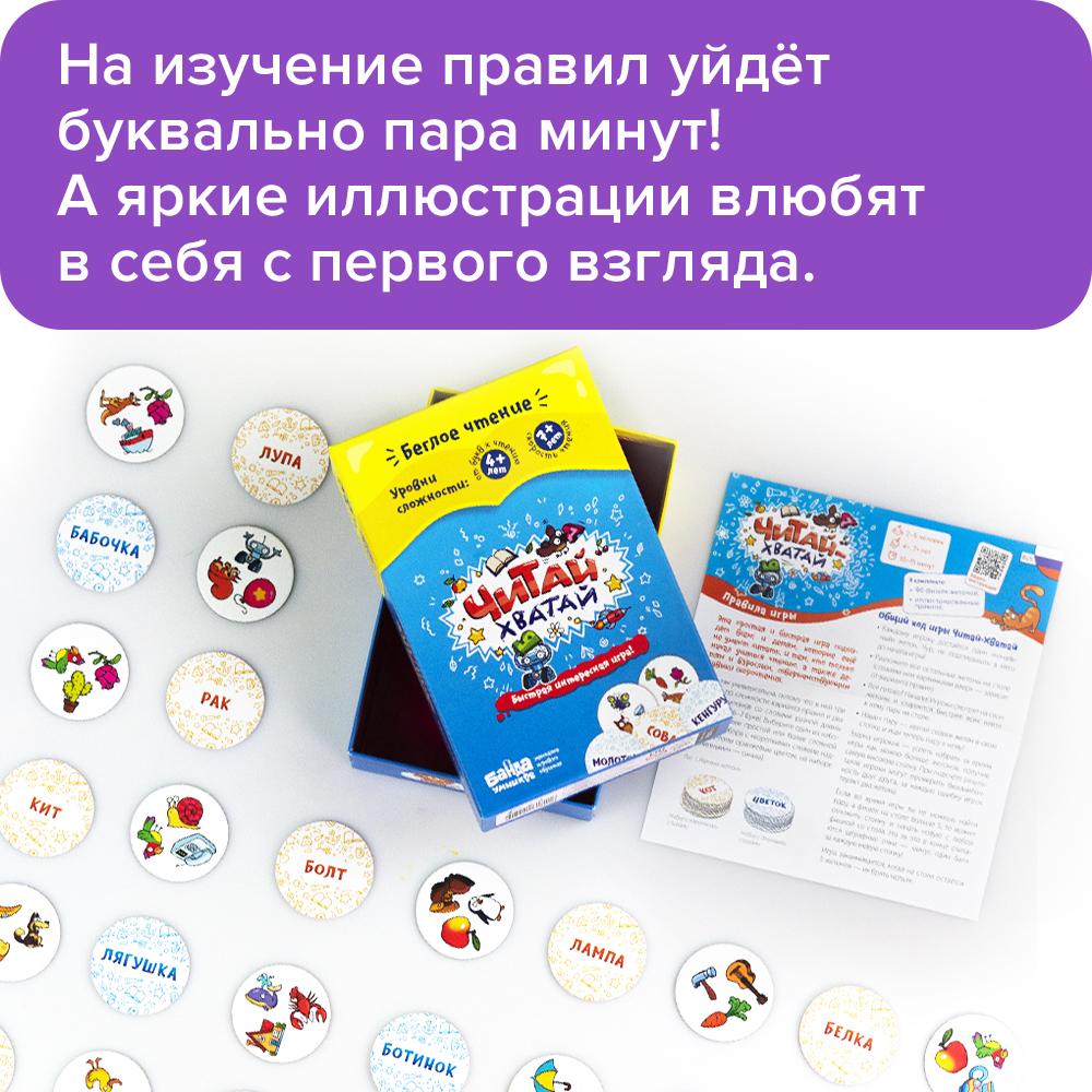Если ребёнок ещё не умеет читать, то «Читай-Хватай» — отличный повод начать! Игра сама подталкивает малышей к тому, чтобы прочитать свои первые слова. А для ребят постарше «Читай-Хватай» — самый весёлый и эффективный способ развить скорочтение. При этом игра настолько простая, что на изучение правил уходит буквально 5 минут! 4+ лет: обучение чтению. 8+ лет: развитие скорочтения. Для чего? Эта игра учит детей читать быстрее. Это вам не скучная «мама мыла раму», а забавная настолка, в которой нужно хватать фишки наперегонки. Как выиграть? Очень просто — нужно нахватать как можно больше фишек из общей кучи в свою стопочку, предварительно прочитав слова на них. В такой напряжённой атмосфере поневоле начинаешь читать всё быстрее и быстрее! В комплекте 96 фишек-жетонов Иллюстрированные правила.