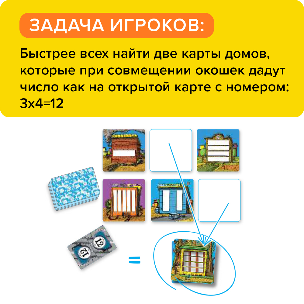 5+.«Много-много» — самый наглядный и простой способ познакомиться с умножением. Настольная игра позволяет детям не только научиться легко умножать числа от 1 до 5, но и собственными глазами увидеть, как происходит процесс умножения — в этом помогут красочные карточки с прозрачными окошками! 2-5 игроков, возраст: 5+, 8+. Для чего? При накладывании карты домика с двумя окошками на карту с тремя окошками мы получаем домик с шестью окнами. Умножение сразу стало наглядным и понятным. Почему так не делают в школе?! Как выиграть? Чтобы победить, нужно строить дома с заданным количеством окон. В быстром варианте игры это нужно делать быстрее всех, а в варианте «на подумать» надо проявить стратегическое мышление. В комплекте 30 пластиковых карт с прозрачными окошками 24 карты с номерами Игровая фишка Иллюстрированные правила.