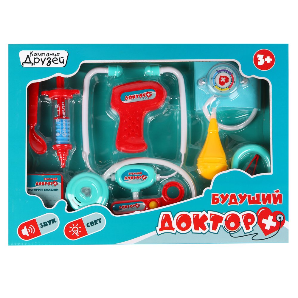 Если заболела любимая игрушка, нужно срочно принимать меры! Ведь здоровье -это самое главное! Детский набор доктора из серии "Будущий Доктор" торговой марки "Компания Друзей" станет отличным подарком для ребенка, мечтающего стать врачом. В нем есть всё для оказания первой медицинской помощи. Игровой набор надолго увлечет малыша, ведь с ним можно придумать множество интересных сюжетов. А еще такой набор позволит крохе не бояться врачей и медицинских инструментов. Игрушка идеально подойдет малышу благодаря ряду особенностей: • в набор входит 9 игрушечных медицинских инструментов: стетоскоп, градусник, шприц, тонометр, ножницы, история болезни и др.; • стетоскоп воспроизводит звуки стука сердца и мигает красным светом, градусник мигает красным при измерении температуры, что делает игру еще интереснее и реалистичнее; • все предметы хорошо детализированы и похожи на настоящие инструменты; • элементы набора безопасны для игры и не имеют острых углов. Сюжетная игра поможет развить воображение, научит малыша ответственности, заботе о близких, а также познакомит с новыми профессиями. Комплект сделан из качественных материалов, полностью безопасен для детей, имеет необходимый сертификат и соответствует установленным требованиям. Характеристики: Возраст от 3 лет Функции: свет, звук Комплектация: 9 предметов Материал: пластик Батарейки: 2 шт AG13, 2 шт AG10, входят в комплект Размер упаковки: 36 х 4,5 х 26 см Упаковка: красочная коробка