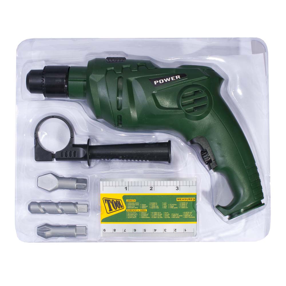 Дрель - помощник в хозяйстве и незаменимый инструмент для настоящего мужчины. Игрушечная дрель в точности копирует настоящую, изготовлена в прочном пластиковом корпусе, а также оснащена звуковыми эффектами. Главной особенностью является крутящееся сверло игрушки, имитирующее работу настоящего перфоратора. При желании, сверла легко сменяются одно на другое. Игрушечная дрель позабавит взрослого, а для малыша будет отличной наукой на будущее и подарит множество часов интересных игр! В наборе: дрель, 3 съемные сверла, линейка, ручка-держатель. Характеристики: - крутящиеся съемные сверла; - звуковые эффекты; - материал: пластик; - размер игрушки: 22х17 см; - питание: 2 батарейки типа АА 1.5V (не входят в комплект).