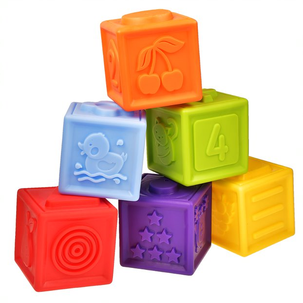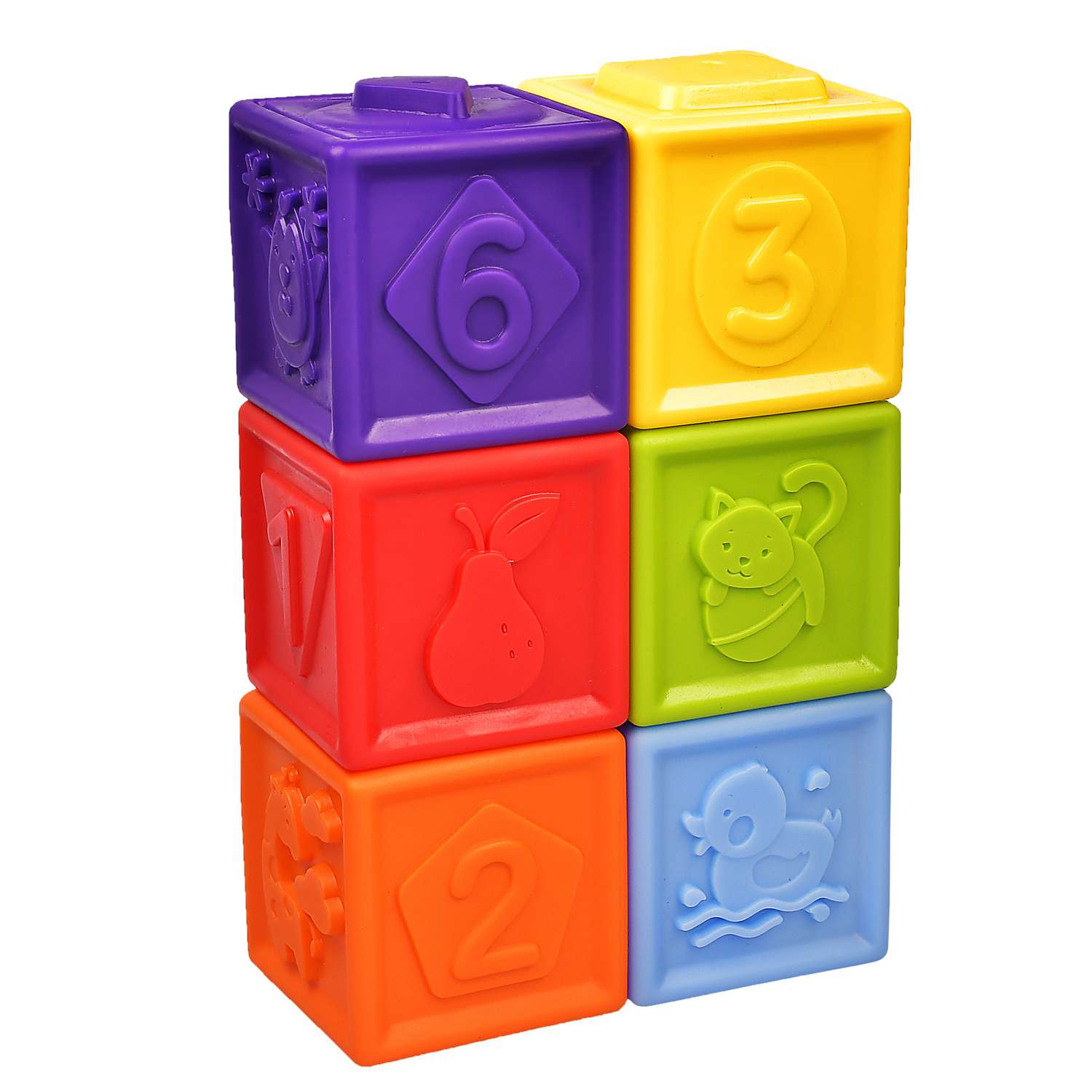 1+.Набор развивающих разноцветных кубиков станет чудесным подарком для любопытной крохи. В игровой набор входит 6 кубиков, играя с которыми малыш научится основам конструирования. Кубики помогут развить пространственное мышление, координацию движений и моторику. На каждом кубике изображены забавные картинки, что делает игру не просто веселой, но и познавательной, ведь играя с кубиками, можно изучать цифры, фрукты и животных. Благодаря рельефной форме кубики можно использовать как сортер или конструктор, достаточно составить соответствующие друг другу по форме кубики. Кубики сделаны из качественного ПВХ-материала, яркие и приятные на ощупь.