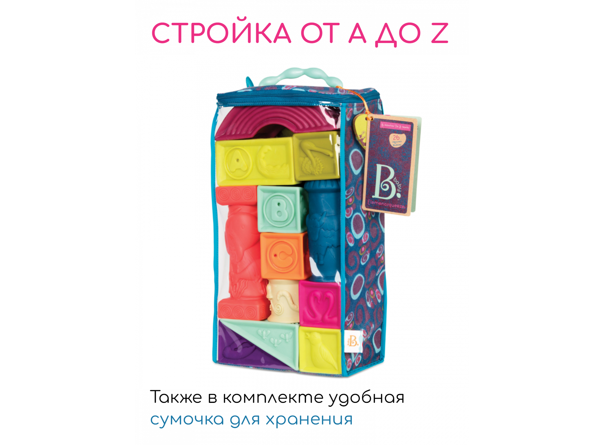 6М+.Стройка от А до Z. Двадцать шесть мягких кубиков и форм для строительства с буквами латинского алфавита и изображениями животных. Можно мять, жевать, купать в ванной, учить буквы и, конечно же, строить! Удобная сумочка для хранения.