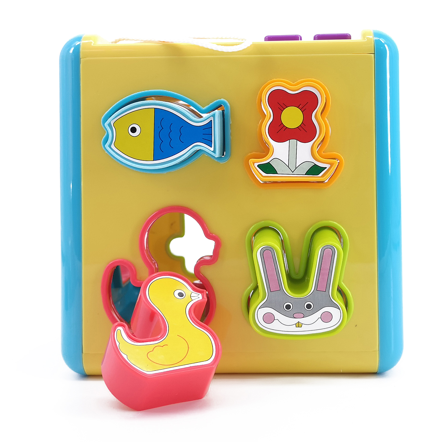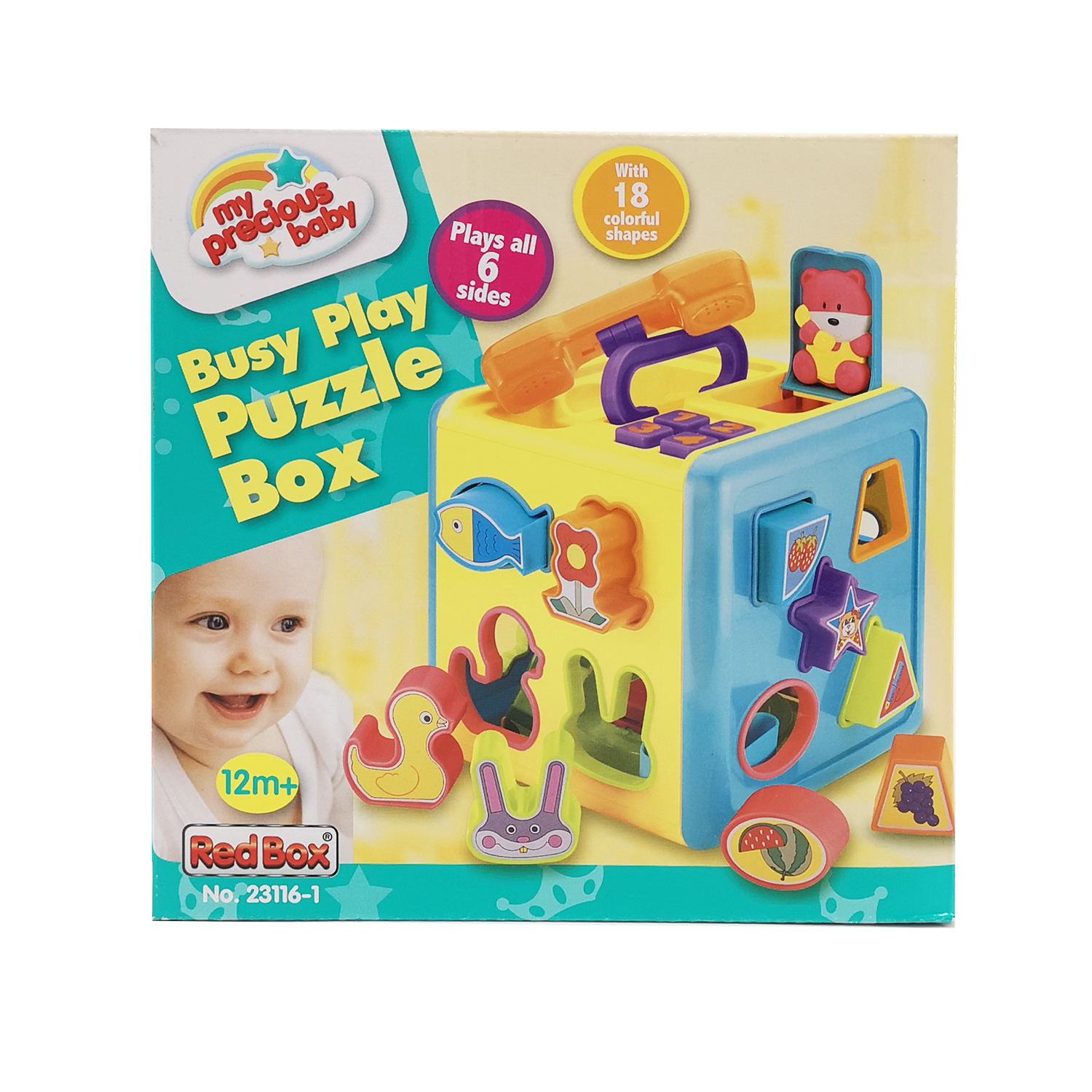 12М+.В стенках куба имеются отверстия разных форм. Задача малыша подобрать им соответствующие предметы. В наборе: 4 предмета с наклейками животных, 10 геометрических фигур с изображениями простых предметов, и 4 цифры.После того, как малыш поместил все формы в куб, их нужно достать.Поставив стрелки часов на 12, можно открыть крышку и достать фигуры. Кроме того, имеется телефонная трубка, издающая звук «бип». Рядом - кнопки от 1 до 4, при нажатии на которые выскакивает панель с мишкой.