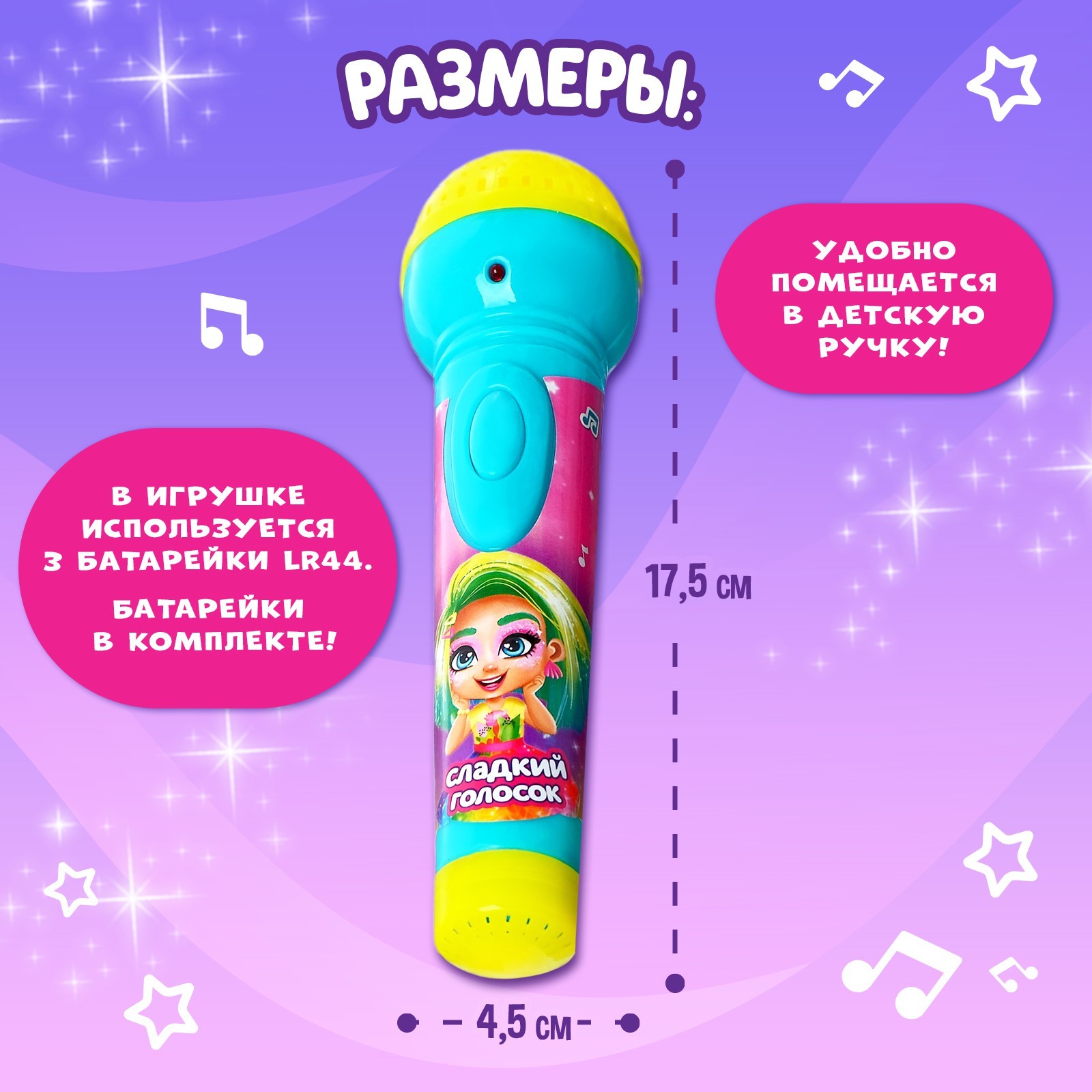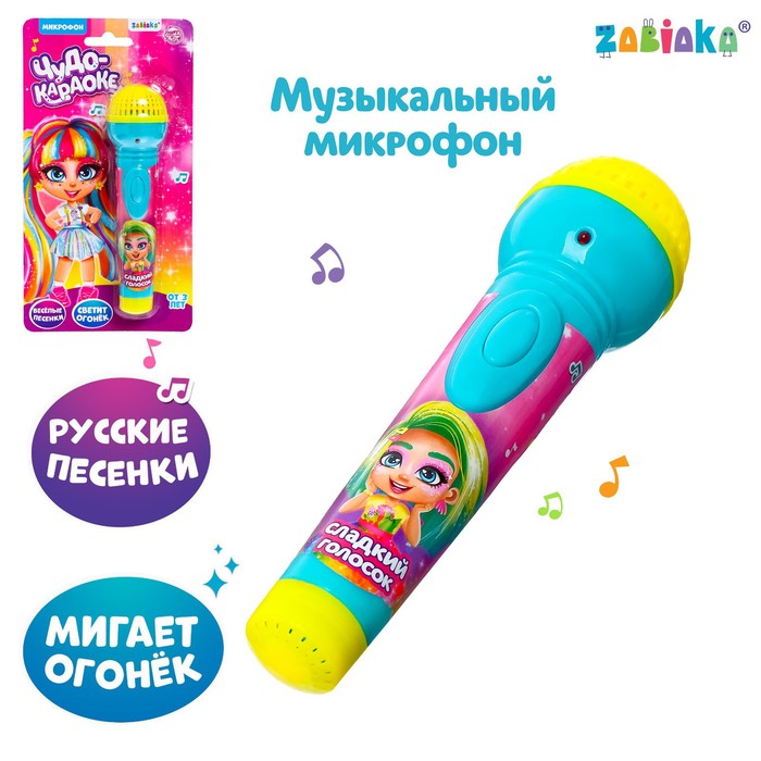 3+.Вместе с музыкальным микрофоном «Сладкий голосок» малышка почувствует себя настоящей артисткой! Ручной микрофон воспроизводит весёлые русские песенки. Также игрушка светится ярким огонёчком. Она очень удобная и компактная, поэтому можно устраивать концерты где угодно. Для помощи малышке текст одной из песенок напечатан на упаковке игрушки! Читайте слова и пойте вместе!