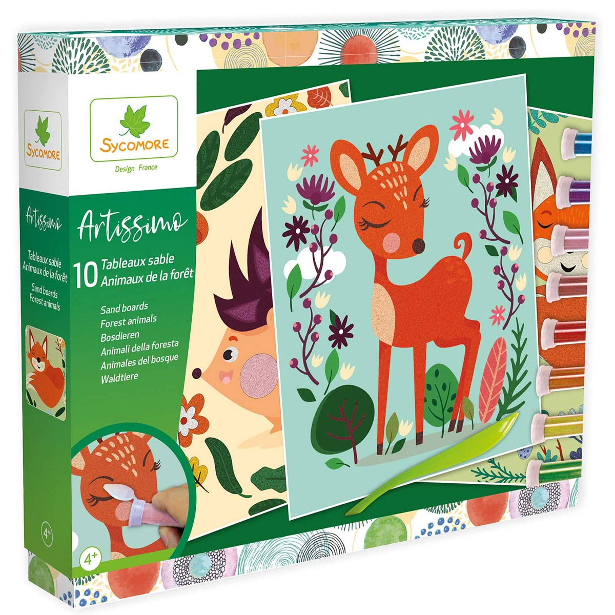 4+.С набором для декорирования Sycomore Artissimo «Лесные животные» ребёнок сможет создать невероятно красивые картины с помощью разноцветных блёсток. В набор входят картины-заготовки, которые нужно украсить блестками, чтобы они мерцали. С помощью пластикового шпателя снимается деталь за деталью рисунка, открывая клейкую поверхность. Затем на этот участок посыпается блестками. Лишние блёстки отправляются отправляются обратно в коробку, а липкий участок теперь волшебно переливается всеми цветами радуги. И так со всей картиной.