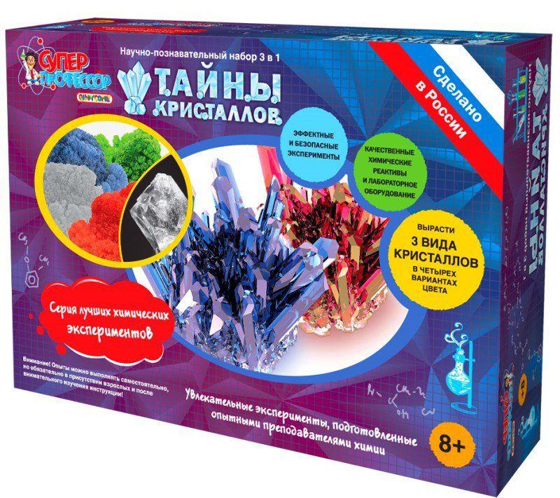Серия научно-познавательных наборов «СуперПрофессор: Лучшие химические эксперименты» - это наборы для проведения безопасных и простых в реализации экспериментов, которые смогут заинтересовать любого ребенка и показать, что химия - это невероятно увлекательная наука, которая рассказывает нам о процессах, происходящих каждый день с нами и вокруг нас. Все наборы разработаны и описаны научными сотрудниками, а для экспериментов используется настоящее лабораторное оборудование и качественные химические реактивы. В каждом наборе подробное описание и красочные иллюстрации. Количество компонентов рассчитано на проведение экспериментов НЕСКОЛЬКО раз. Научно-познавательный набор "Тайны кристаллов" предназначен для наглядного изучения механизма образования кристаллов различной формы и видов. С его помощью вы сможете вырастить три вида кристаллов: "пушистые", моно- и поликристаллы в четырёх вариантах цвета. Для безопасного проведения экспериментов и получения эффектного результата не нужно никаких специальных знаний и навыков, просто следуйте инструкции. 8+