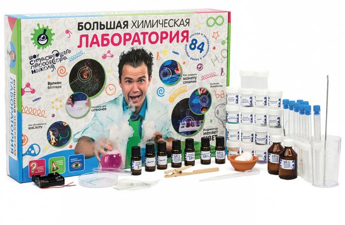 12+.Это по-настоящему большой набор химических реактивов и посуды, которому будет рад даже продвинутый юный химик. Набор Большая химическая лаборатория предназначен для детей в возрасте от 10 лет и позволяет самостоятельно провести более 80 химических опытов. В набор Большая химическая лаборатория входит более 20 реактивов: соляная кислота, азотная кислота, сульфат никеля, дихромат аммония, цинк, железо, щавелевая кислота, калий йодистый, калий хлористый, раствор аммиака, ацетон, нитрат серебра и многое другое. Также в наборе имеется лабораторная посуда и оборудование — пробирки, чашка для выпаривания, штатив, держатель для пробирок, мерный стакан, ершик. Как и любой набор, Большая химическая лаборатория не обошлась без лакмусовой бумаги. Кроме того в наборе имеется шпатель, одноразовые перчатки, батарейный блок и сухой спирт. Комплект набора Большая химическая лаборатория сумасшедшего профессора Николя значительно больше и богаче большинства химических наборов для опытов. Инструкция-это полноценная цветная брошюра, в которой объяснены правила безопасности и дано описание 80 химических экспериментов. К каждому эксперименту имеются понятные фотоиллюстрации. Способствует развитию познавательной активности, представлений о предметах и явлениях окружающего мира, необходимых для школьного обучения навыков, абстрактного мышления.