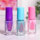 3+.Такой маникюрный набор безопасен для ребёнка, поэтому юная модница сможет украшать свои ноготки без вреда для здоровья. Лак изготовлен на водной основе и легко удаляется с ногтей обычной водой. Нежные пастельные тона подойдут для первых экспериментов. Небольшая и яркая коробочка с таким набором станет приятным подарком для девочки. Комплектация: лак для ногтей блёстки пилка наклейки