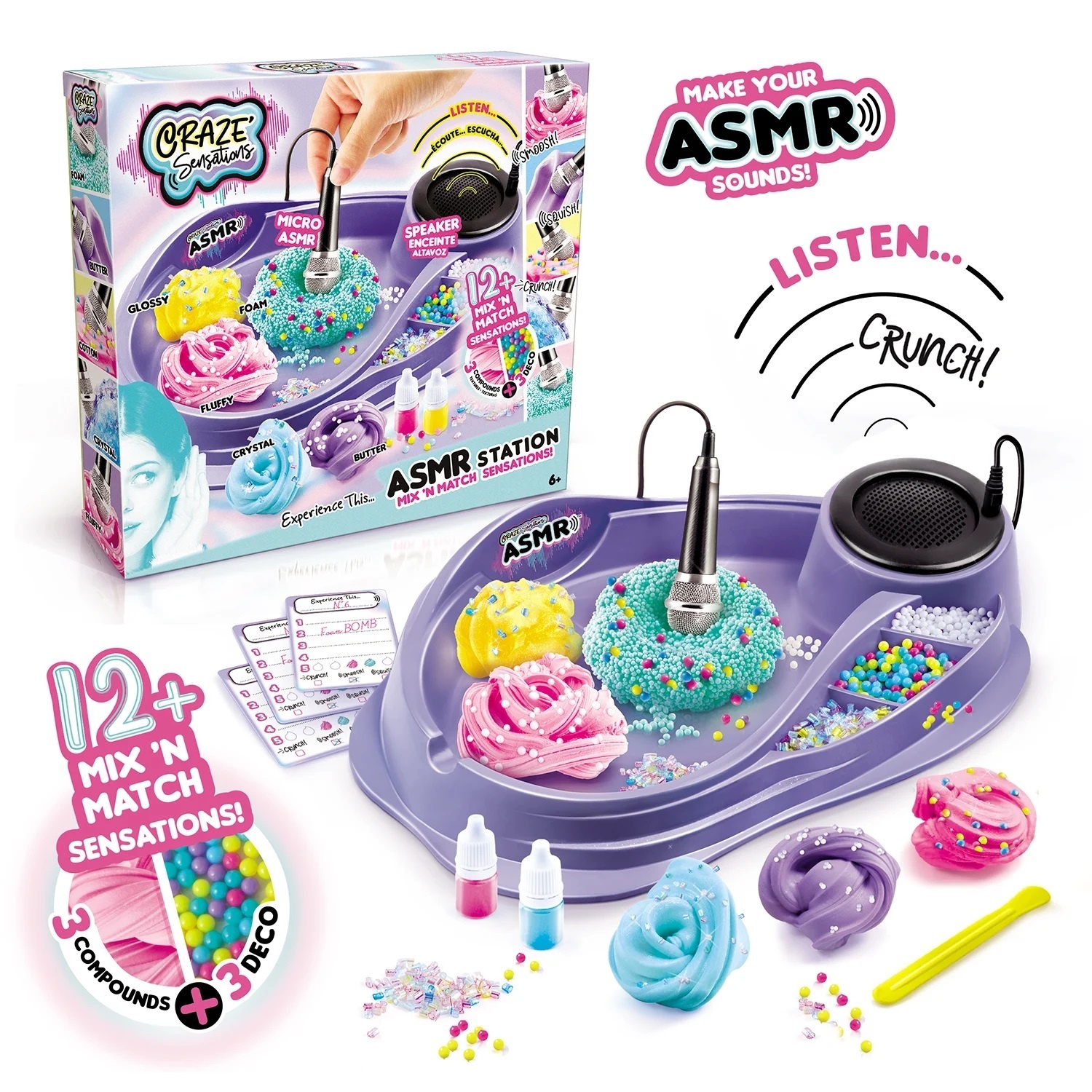 6+.Craze Sensations это линейка продуктов в ассортименте французской компании Canal Toys. Идея ее создания появилась благодаря новому направлению, набирающему все большую популярность во всем мире. ASMR эффект-возможность избавиться от стресса благодаря реакции мозга на определенные слуховые, визуальные и тактильные ощущения. Приглушенные повторяющиеся звуки, привлекательные цвета и приятные на ощупь текстуры завораживают и погружают в состояние спокойствия и умиротворенности. Каждый набор представляет собой целую ASMR-лабораторию с возможностью создания бесконечного количества своих собственных ASMR эффектов! Игровой элемент "база-подставка с колонкой и микрофоном"-1 шт. Слайм-3 вида/3 упаковки Окрашивающее вещество-3 флакончика Декоративные элементы для слайма-3 упаковки Бумажные карточки-4 шт. Емкость для хранения слайма-6 шт. Лист с наклейками-1 шт. Инструмент для смешивания слайма-1 шт. Требуемый элемент питания: 3 батарейки 1,5 V AАA (не в комплекте) Комплектация База-подставка, слайм-3 шт, окрашивающее вещество-3 шт, декоративные элементы-3 шт, наклейки-1 лист