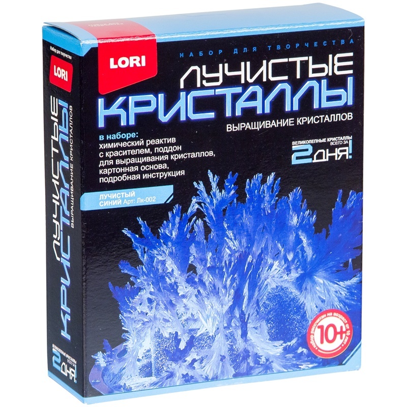 Набор для творчества от компании Lori для детей старше 10 лет. Всего за два для ребенок сможет вырастить красивый кристалл синего цвета и украсить им свою комнату. Инструкция и все необходимое идет в комплекте. Набор для изготовления лучистых кристаллов – это химический опыт, результат которого виден уже через два дня. Красивый кристалл в специальной подставке станет отличным украшением интерьера. Комплектация: Химический реактив с красителем, поддон для выращивания кристаллов, картонная основа, подроная инструкция.