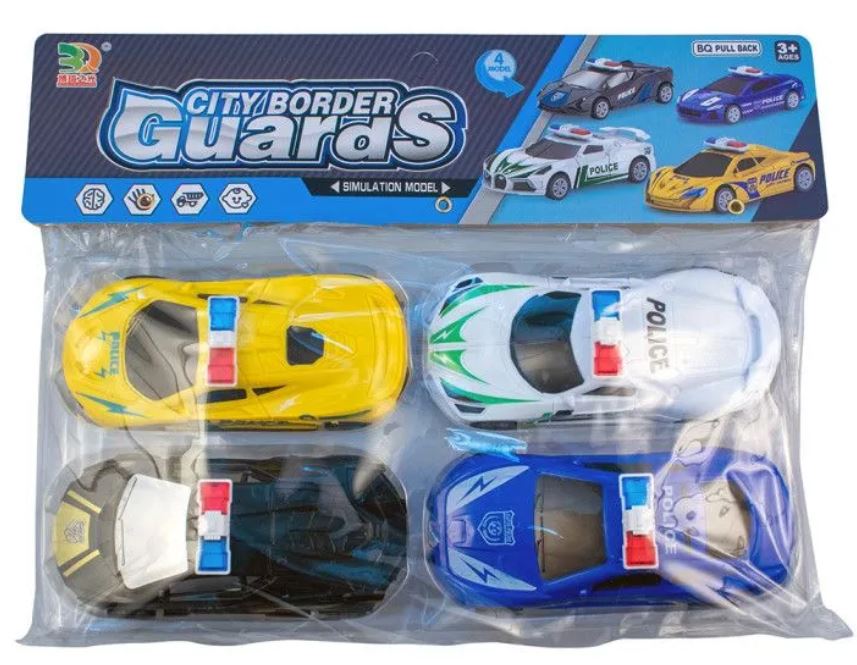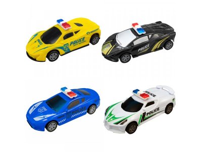 3+.Набор полицейских машинок из 4-х шт. Размер машинки составляет 12,5*5,2*4 см. Машинка выполнена из пластика. Машинки без инерционного механизма.
