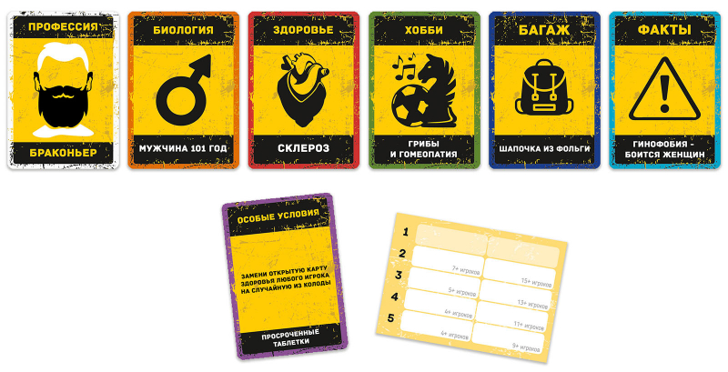 18+.На Земле грядет глобальная катастрофа. Вам повезло, вы оказались перед входом в спасательный бункер, в котором можно пережить самый опасный период. Но попасть в бункер смогут не все — а лишь половина из вас! За несколько раундов игроки решают, кого НЕ берут в бункер. Попавшие в бункер — выживут, чтобы затем возродить цивилизацию. Игроки получают несколько случайных карт характеристик: пол и возраст, профессия, здоровье, хобби и др. Постепенно вы раскрываете свои карты, знакомитесь друг с другом и принимаете решения, кто и насколько будет полезен для выживания и восстановления жизни после выхода из бункера.