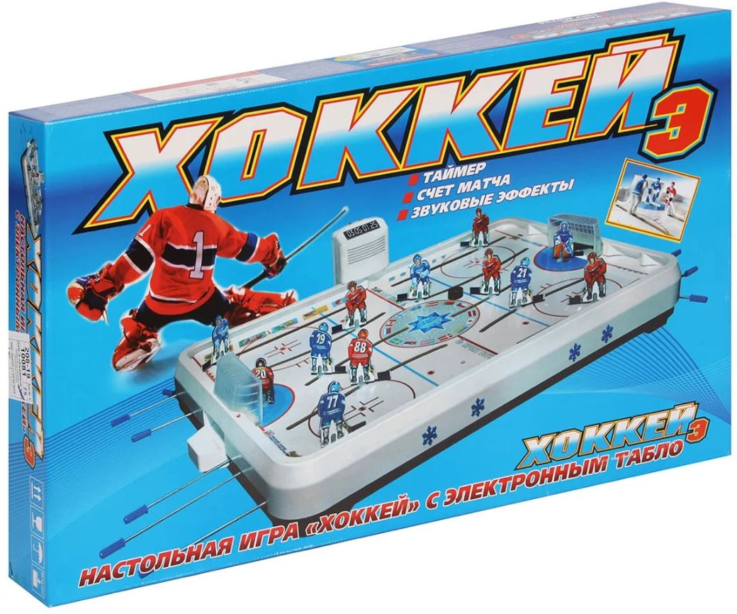 Настольный хоккей внесет в Ваш дом настоящий спортивный азарт, позволит ощутить радость побед и удовольствие от общения с друзьями. В наборе: игровое поле (65х44 см.); электронное табло; объёмные фигурки хоккеистов (12 шт.); объёмные фигурки вратарей (2 шт.); ворота (2 шт.); шайба (2 шт.); наклейки (цифры от 1 до 24). При длительном нажатии кнопки "Пуск", звучит свисток арбитра и начинается отсчёт времени на табло. При попадании по воротам звучит гул трибун и на табло засчитывается гол. Питание электронного табло осуществляется от 3 батареек "АА" напряжением 1,5 вольт. Элементы питания в комплект игрушки не входят.