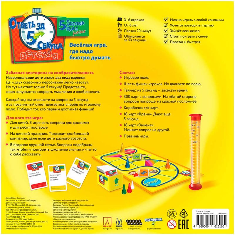 6+.Забавная викторина на сообразительность. Наверняка ваши дети знают два вида варенья. Да и двух сказочных персонажей легко назовут. Но тут на ответ только 5 секунд! Представьте, какая запускается скорость мышления и воображения. Каждый ход вы отвечаете на вопрос за 5 секунд и за правильный ответ двигаетесь вперёд по игровому полю. Победит тот, кто первым достигнет финиша! Для кого эта игра: Для детей. В игре есть вопросы для дошколят и для ребят постарше На детский праздник. Подходит для большой компании, даже если дети разного возраста В подарок дружной семье. Вопросы подобраны так, чтобы и повторить школьные знания, и что-то о себе рассказать