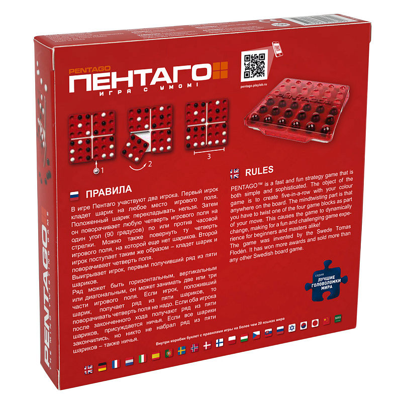 8+.Настольная игра Пентаго - это логическая игра придуманная в Швеции. Игра очень похожа на крестики-нолики, но значительно более динамичная и интересная. В Пентаго участвуют два игрока. Игра начинается с пустого поля, игроки по очереди ставят по 1 шарику на свободне места. Положенный шарик перекладывать нельзя. Положивший шарик игрок, затем поворачивает любую четверть игрового поля на один угол (90º), по или против часовой стрелки, меняя таким образом игровое поле, чтобы помешать планам противника собрать свой ряд. Можно также повернуть ту четверть игрового поля, на которой еще нет шариков. Затем противник поступает таким же образом – кладет шарик и поворачивает четверть поля. Выигрывает игрок, первым получивший ряд из пяти шариков. Ряд может быть горизонтальным, вертикальным или диагональным, он может занимать две или три части игрового поля. Если игрок, сделавший ход, сразу получает ряд из пяти шариков, то поворачивать четверть поля не надо. Если оба игрока после законченного хода получают ряд из пяти шариков, присуждается ничья. Если все шарики закончились, но никто не набрал ряд из пяти шариков – также ничья.