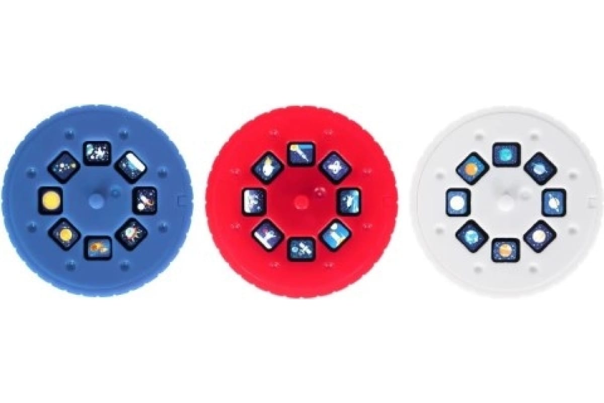 3+.Bresser Space Rocket Slide – это набор «2 в 1», который станет прекрасным подарком ребенку и порадует всю семью. Как проектор он позволяет выводить на любую ровную поверхность 24 забавных изображения космоса – в комплекте 3 тематических слайда, по 8 изображений на каждом. Также прибор может превратиться в лампу-ночник с мягким светом. Ее можно использовать стационарно или, сняв с подставки, осветить себе путь – например, в темном коридоре квартиры. Для проецирования слайдов оптимальным расстоянием является 1,8–2,4 метра до поверхности, есть возможность подстройки фокуса в ручном режиме. Для питания прибора требуется одна стандартная батарейка.
