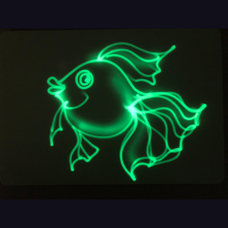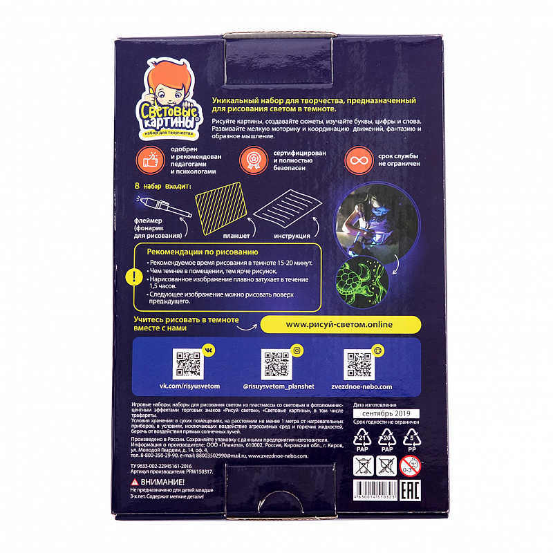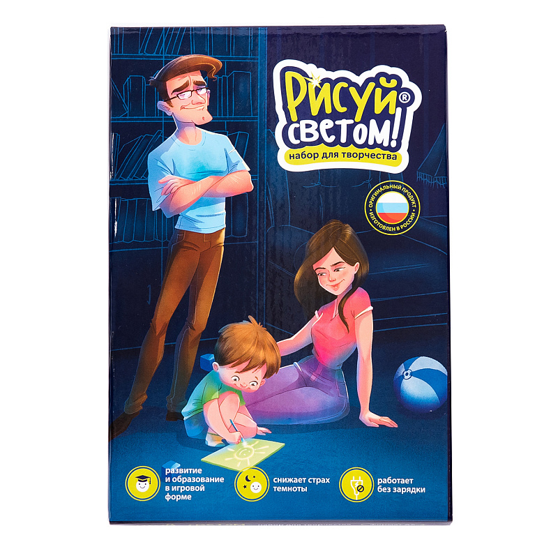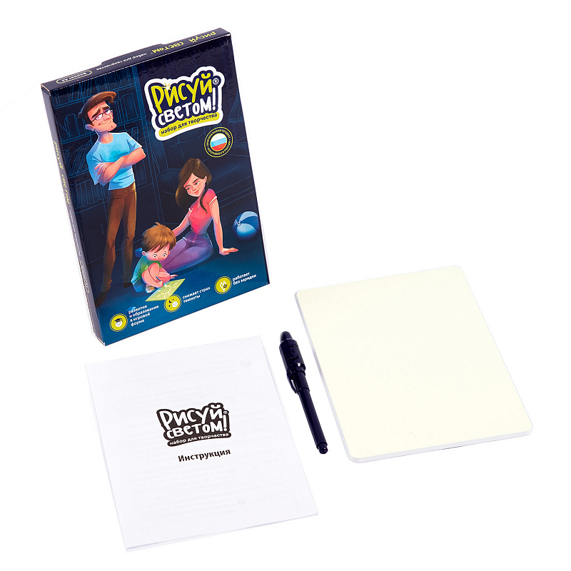 3+.Уникальный набор для творчества в мини-формате А5, предназначенный для рисования светом в темноте. Игра способствует преодолению ребенком страха темноты. Создавайте сюжеты и рисуйте картины, светящиеся в темноте, с помощью специального маркера и планшета. Чем темнее в помещении, тем ярче рисунок Нарисованное изображение плавно затухает в течение 1,5 часов Новое изображение можно рисовать сразу же поверх предыдущего Рекомендуемое время рисования в темноте 15-20 минут